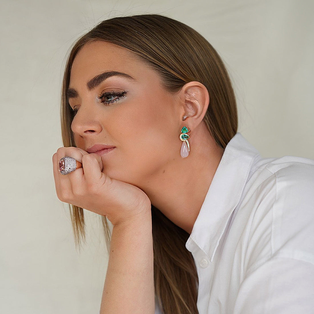 El diseño exclusivo y los colores únicos simbolizan la originalidad y creatividad de la pieza. La piedra en talla triangular y en talla gota de 6 * 9 en color verde esmeralda envueltas con pequeñas circonitas blancas en talla brillante reflejan su perspicacia y capacidad para ver más allá de lo evidente.