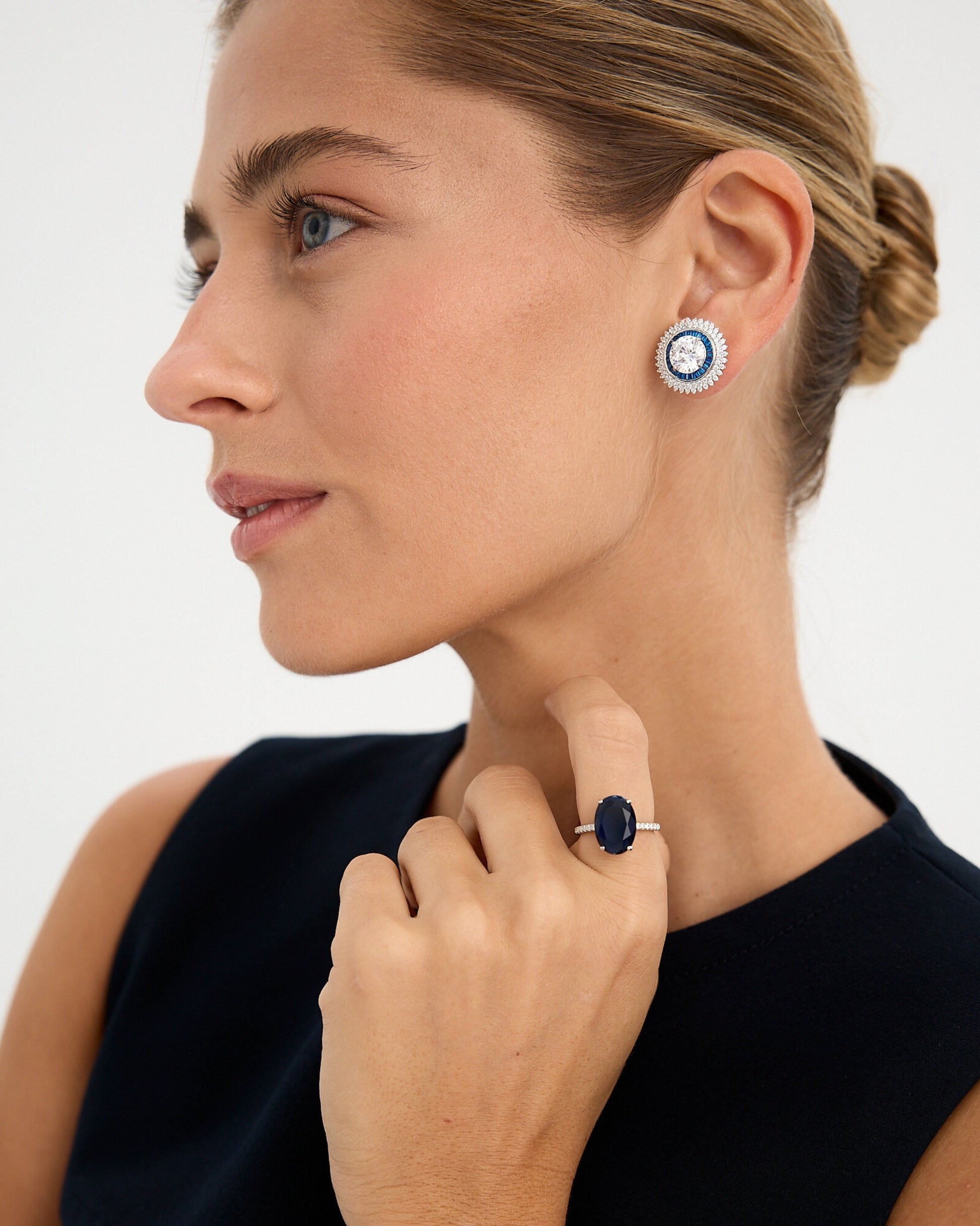 Los pendientes Cielan evocan la sofisticación del glamour de los 90. Realizados en plata de primera ley con baño de rodio blanco, destacan por su piedra principal en talla redonda de 9x9 mm en azul zafiro ceilan, rodeada de circonitas en talla baguette y brillante. Una pieza que combina modernidad y elegancia clásica.