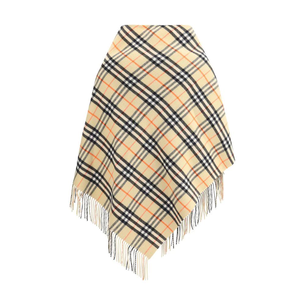 Burberry’s wool and cashmere Cape is an elegant and warm garment featuring the famous Burberry Check pattern. The super-soft finish with embossed fur makes the texture snug and pleasant to the touch. The triangular pattern is embellished with bangs on one end for a touch of sophisticated and classic style.