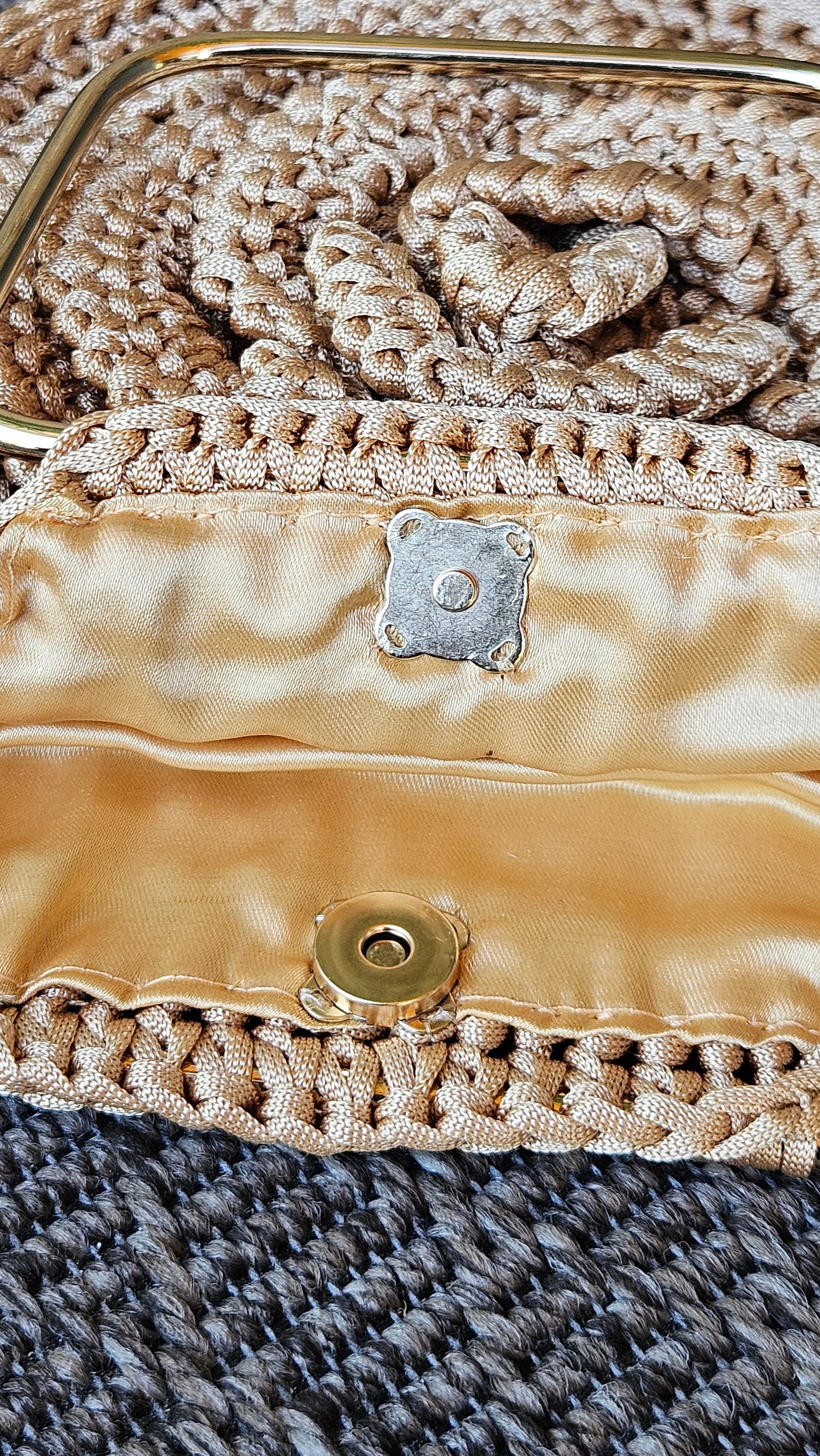 . Mides: 18 cm diàmetre · Fil setinat color beix · Folre interior color beix · Botó magnètic · 2 nanses metàl·liques daurades · Cadena metàl·lica daurada · Etiqueta Unik |